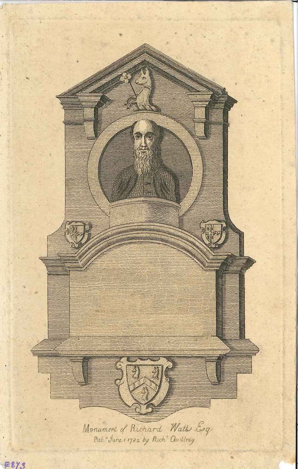 - DescriptionPrint of a view of the monument to Richard Watts in Rochester cathedral; quite crude representation of the bust.