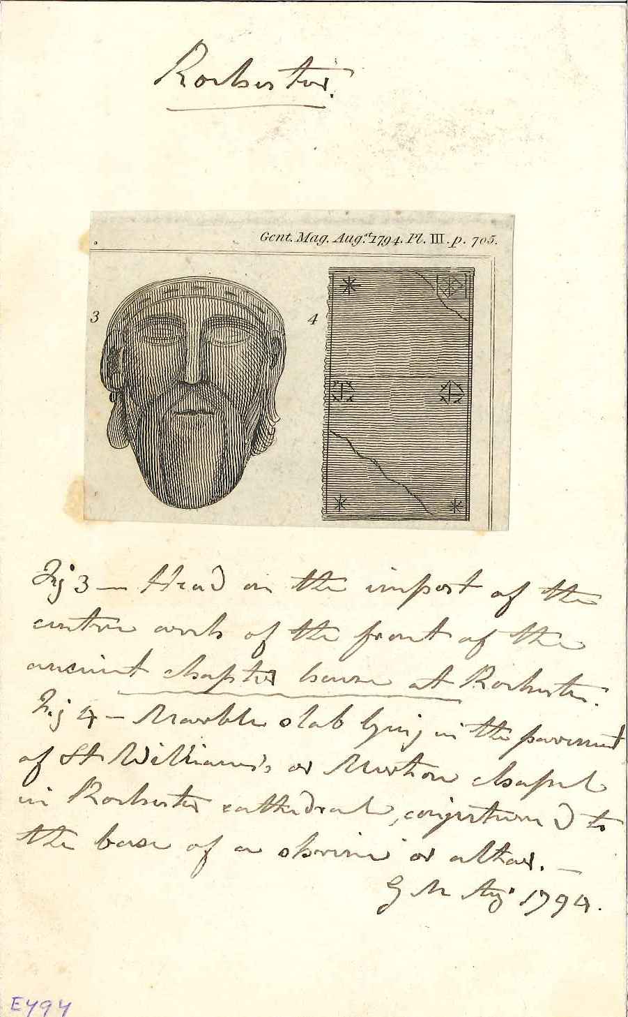 - DescriptionCutting from a print of architectural details at Kentish sites; taken from the August 1794 Gentleman's Magazine; shows: fig.3.carved face, Rochester Chapter House; 4.marble slab, Rochester cathedral. In pencil are hand-written notes (author unknown). For full print of 9.figs see A6414.