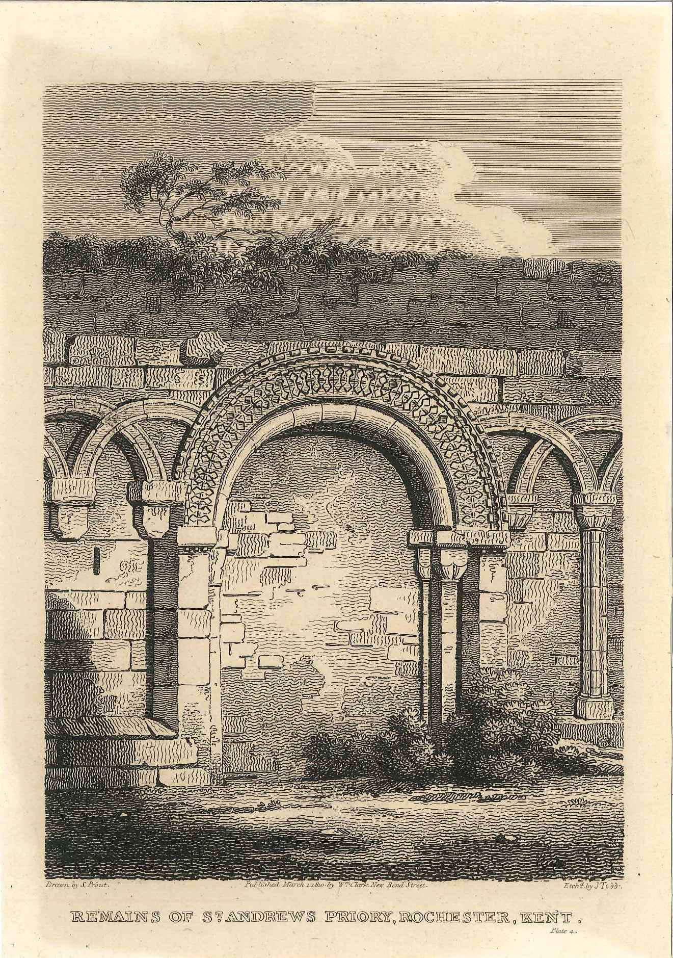 - DescriptionPrint of a detailed view of the priory ruins (chapter house) in the Rochester cathedral grounds in 1810; shows detail of ornate archway, slightly overgrown; printed on very thin paper, backed on to thicker cream paper.