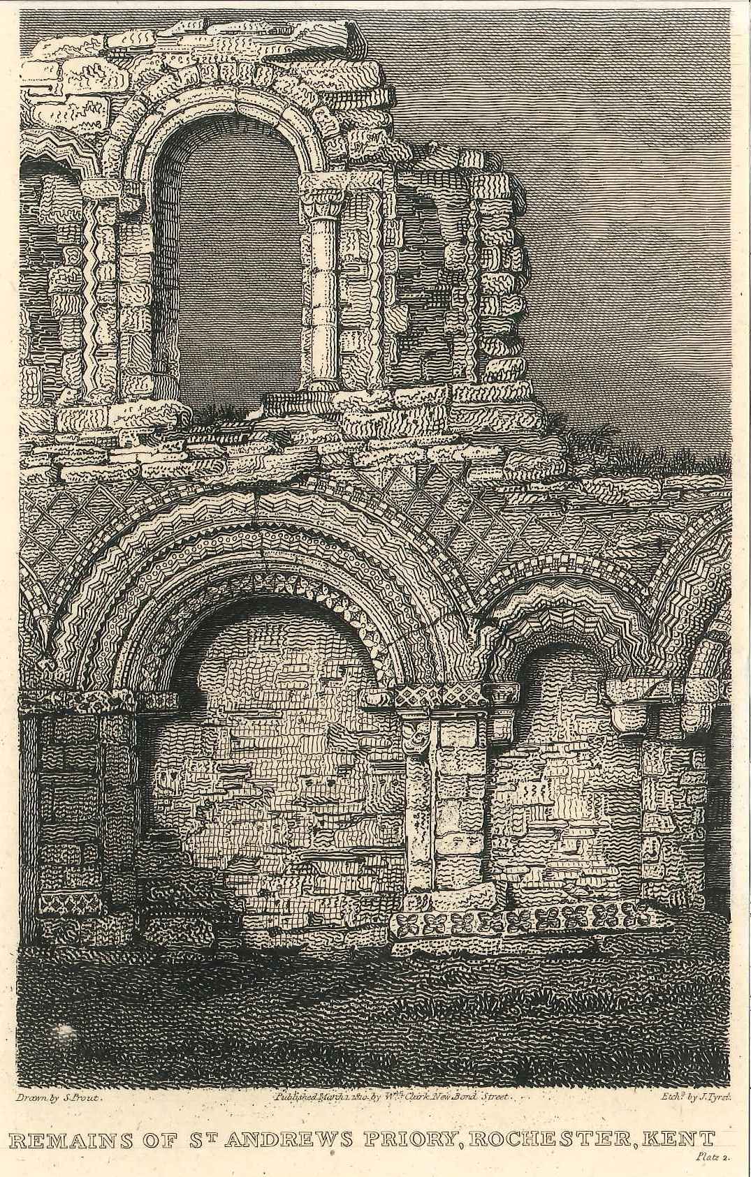 - DescriptionEngraved print of architectural details of the ruins of St Andrew's Priory in Rochester cathedral precinct in 1810; printed on very thin paper, backed on to thicker cream paper.