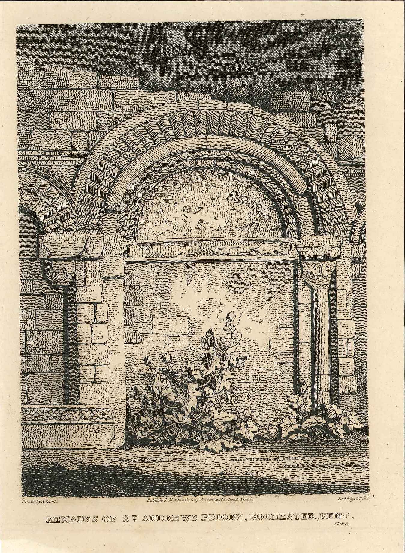 - DescriptionPrint of a detailed view of the priory ruins (chapter house) in the Rochester cathedral grounds in 1810; shows detail of ornate archway, slightly overgrown; printed on very thin paper backed on to thicker cream paper.