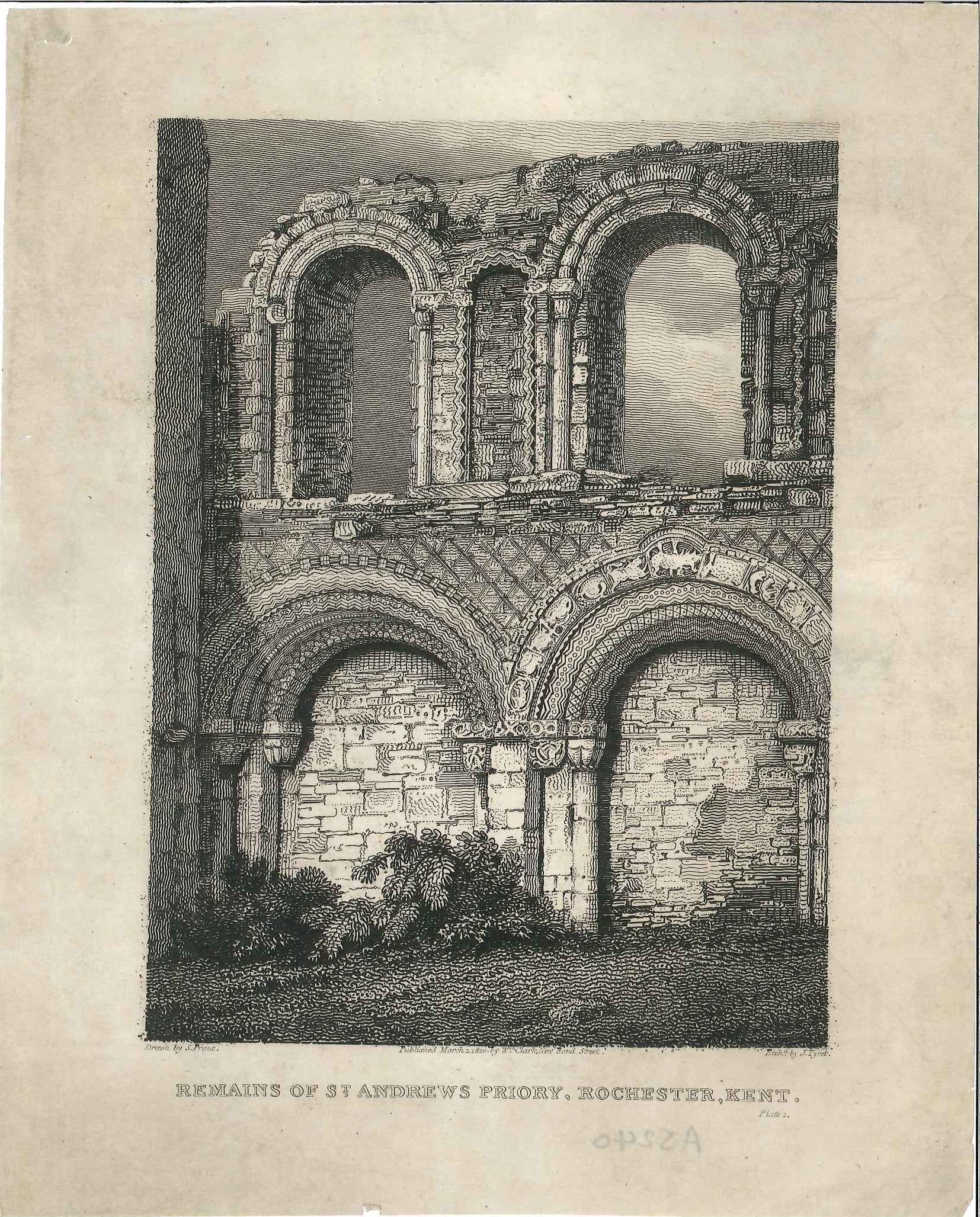 - DescriptionEngraved print of architectural details of the ruins of St Andrew's Priory in Rochester cathedral precinct in 1810, slightly overgrown; printed on very thin paper, with no backing.