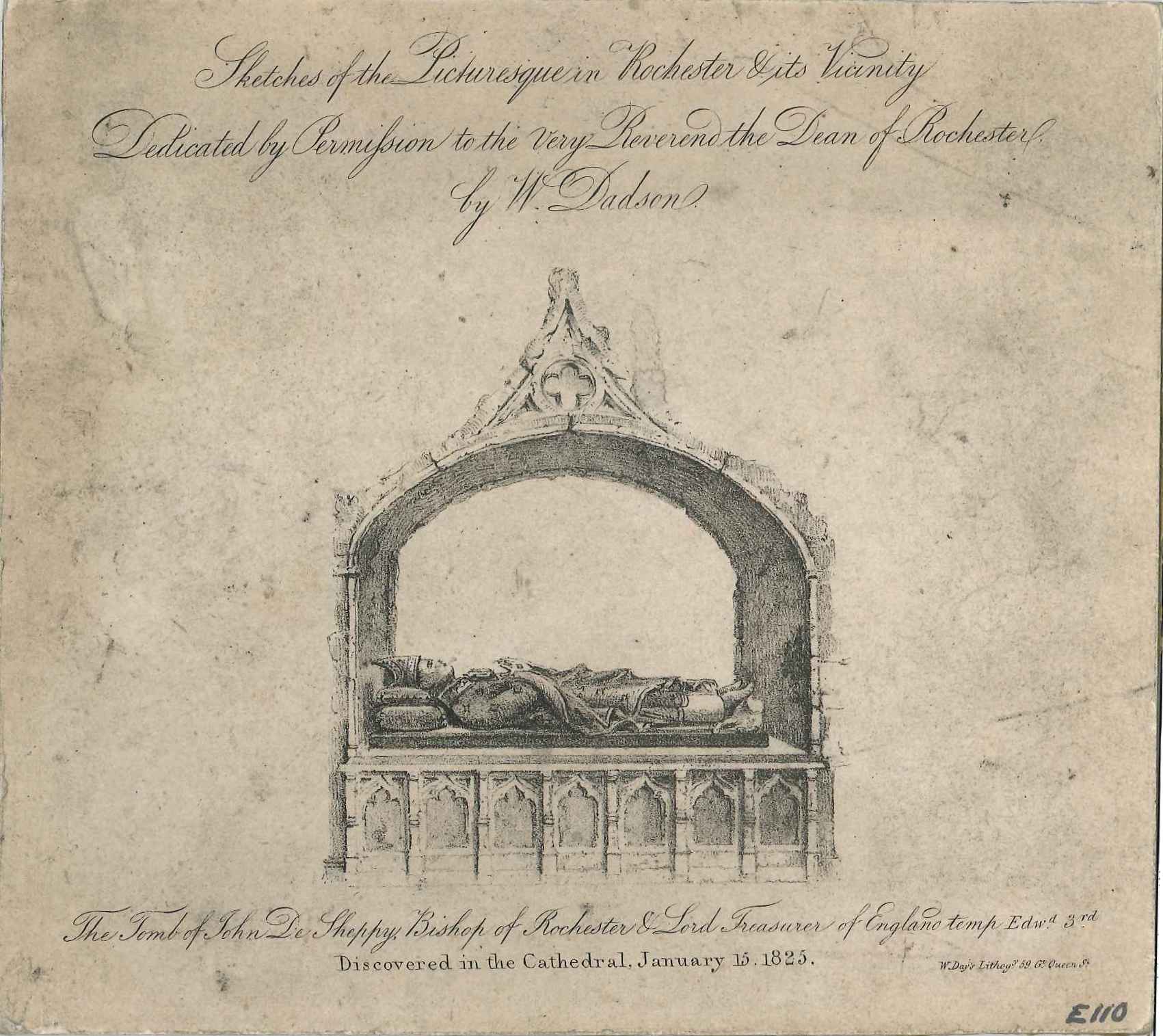 Lithographic print; shows the tomb of bishop John De Sheppey (died 1360) shortly after it was discovered in Rochester Cathedral in 1825; shows recumbent bishop in robes & mitre, hands praying; title page for a book of sketches of Rochester. Mounted on card. Quite dusty & soiled. Produced for 'Sketches of the Picturesque in Rochester and its Vicinity', published by Dadson in 1825.