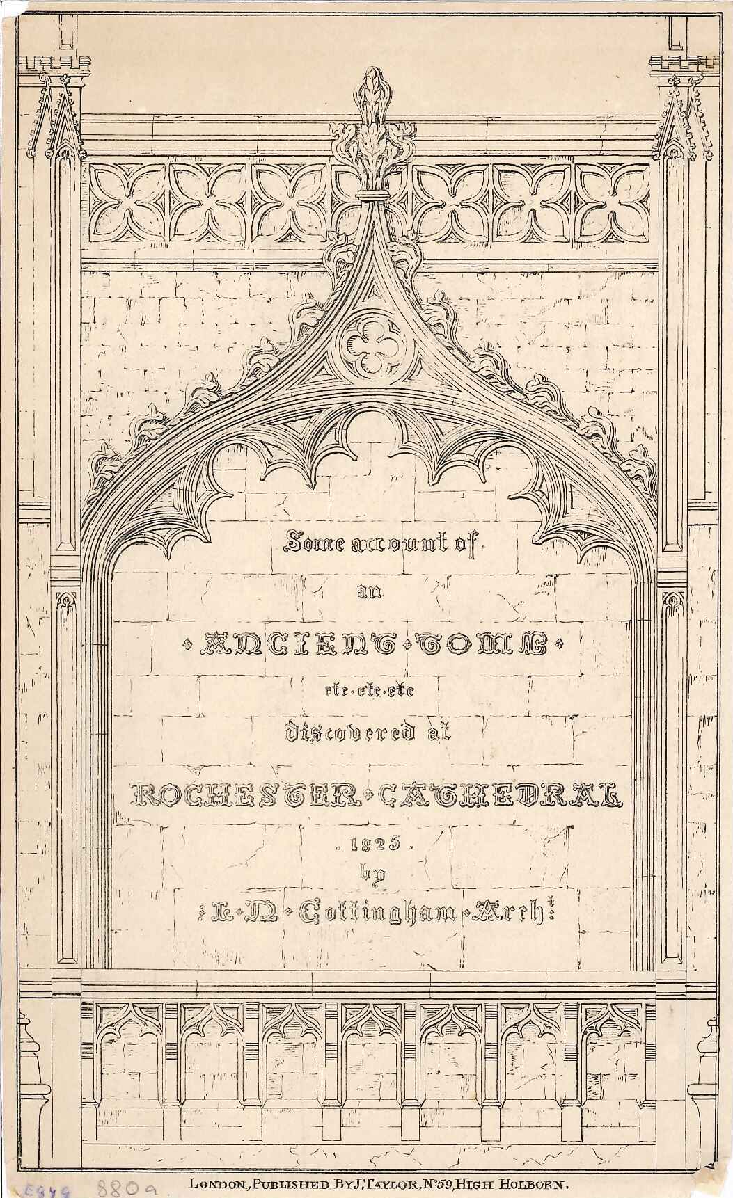 - DescriptionPrint of the surround of the tomb of Bishop John De Sheppey in Rochester cathedral; used as a title page for an article of the discovery of the tomb in 1825. Josiah Taylor was a stationer & printer active at High Holborn 1798-1834.