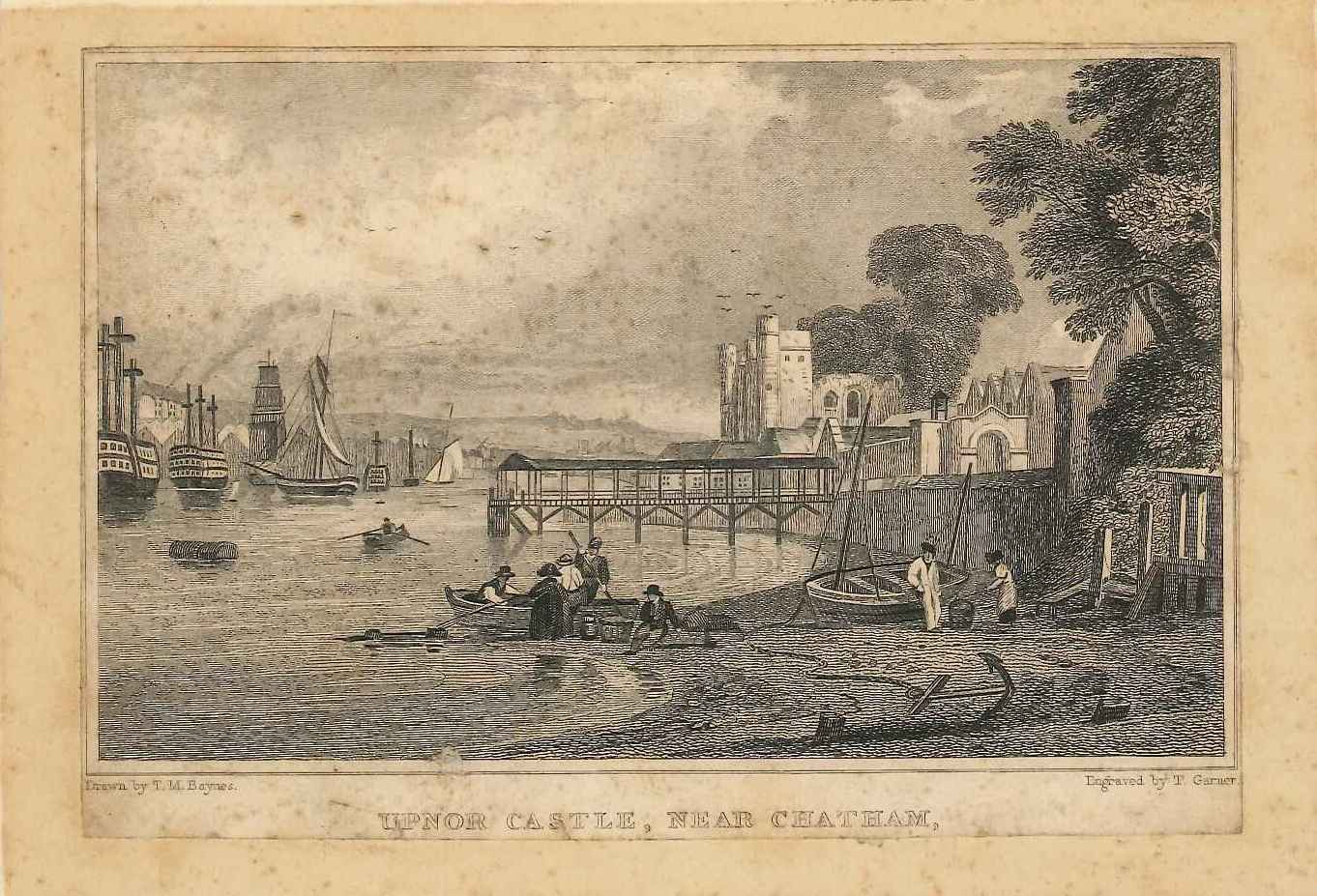 - DescriptionPrint of a view of Upnor castle; in the foreground are beached fishing vessels & men, various Navy vessels on the river opposite Chatham. Mounted on card, some of the text has been trimmed away. Originally produced for the "England's Topographer" series of Kent views (London 1828-1831).
