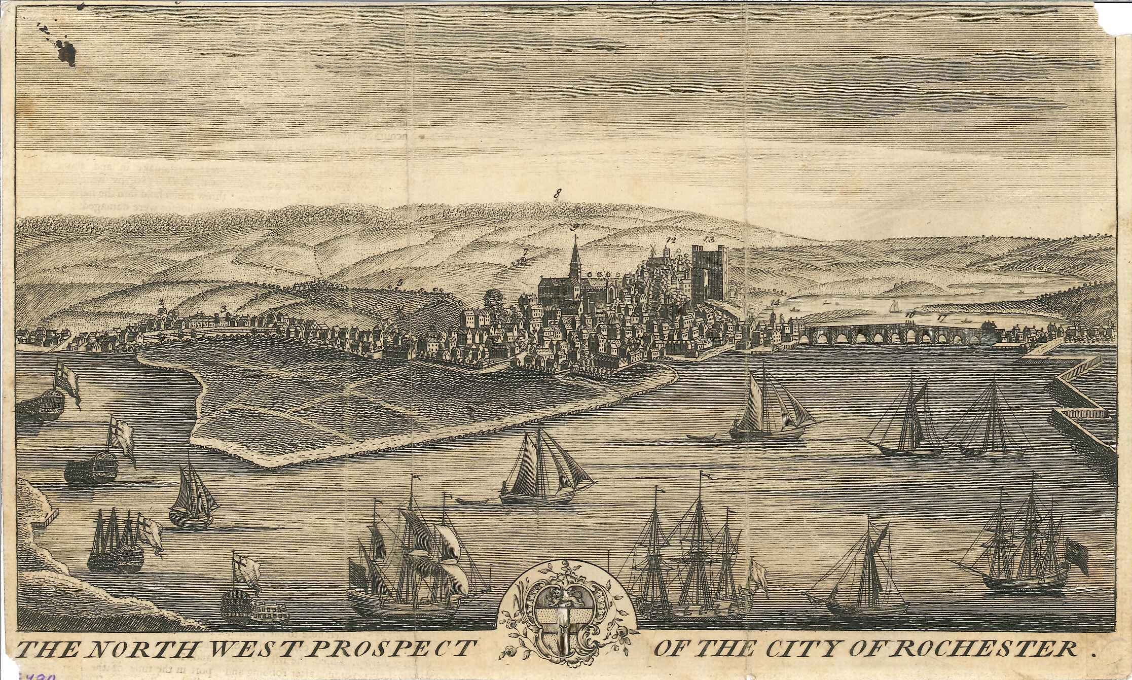 - DescriptionEngraving of an overall view of the City of Rochester, viewed from Frindsbury hill, taking in the Medway valley, including Strood (part), Chatham & Rochester; naive perspective; locations numbered (but key has been trimmed away); various sailing vessels.