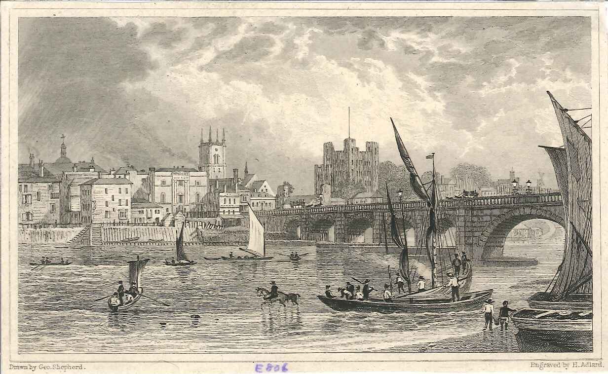 - DescriptionPrint of a view of Rochester bridge with the castle keep & cathedral beyond, from the Strood foreshore; various rowing & sailing vessels, horseman in the shallows; taken from a book. Originally produced for the "England's Topographer" series of Kent views (London 1828-1831).