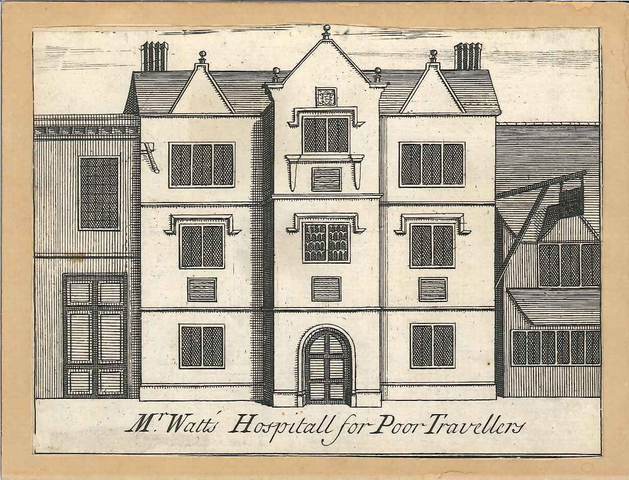 - DescriptionEngraved print of Mr Watt's Hospital (Six Poor Travellers) in Rochester in 1719; cut out of a large print by Harris of 'An Early Prospect of Rochester'; published for Harris's 'History of Kent' but rarely used. Mounted on card. This is one of six surrounding images around the main view of Rochester & Chatham.