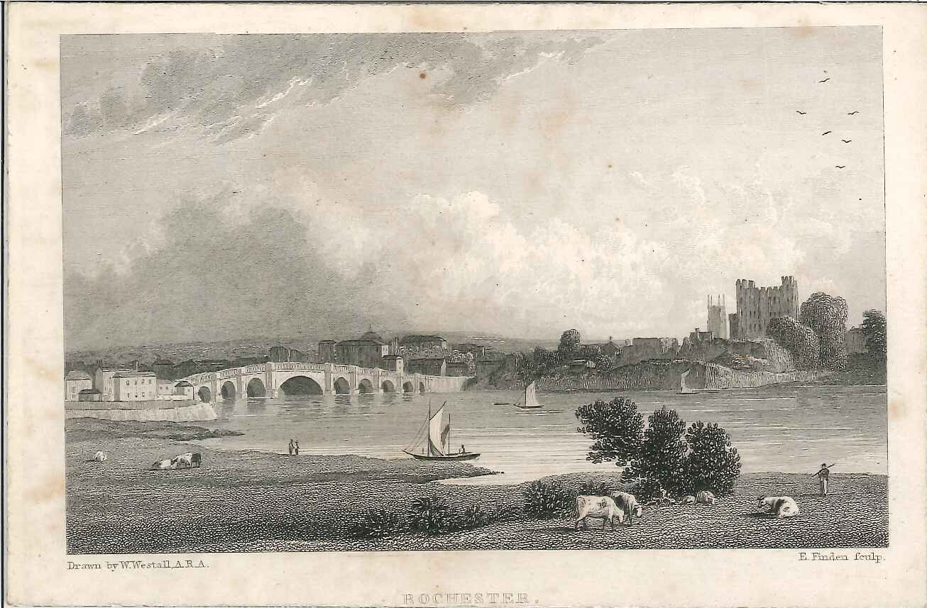 - DescriptionPrint of a view of the River Medway at Rochester; shows bridge, castle & cathedral, and part of Strood; viewed from Temple marshes; cattle in the foreground; mounted on card.