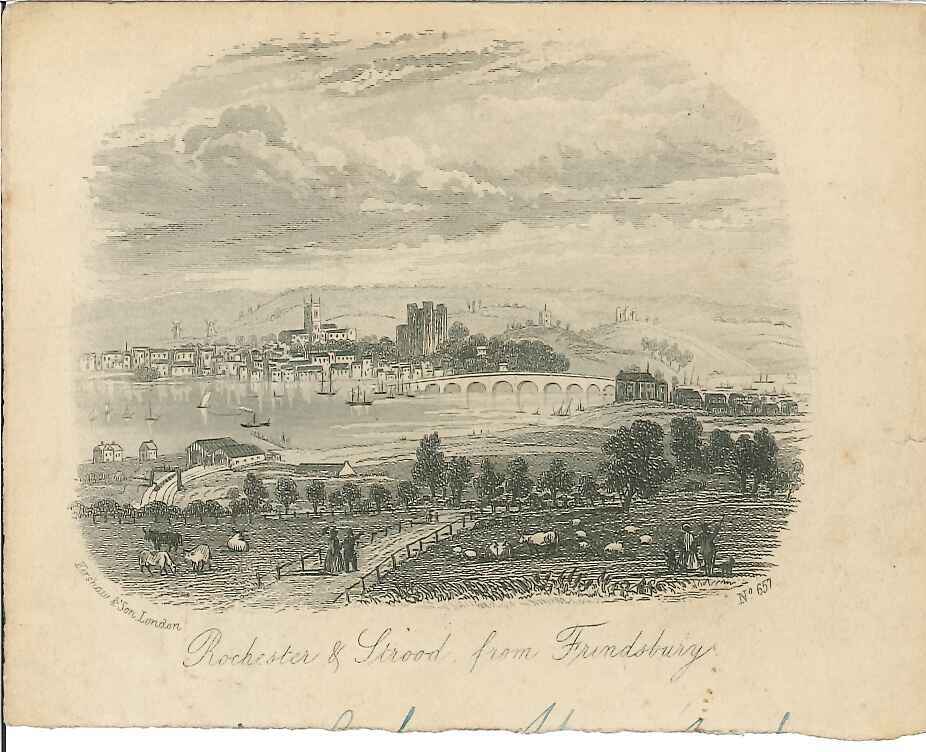 Engraved print of Rochester & Strood, circa 1860; bridge with castle & cathedral beyond; viewed from the Frindsbury foreshore, various vessels on the river; has been used as a headed notelet (handwriting present). Printed by Kershaw & Son, who ran the London Stereoscope Co; printed on folded paper, so intended as a notelet for short letters. Illustrated letterheads like this one were sent by visitors to the seaside, the Lake District, the Scottish Highlands and other British tourist attractions in the mid 19th century. They were precursors of the picture postcards which began to supplant them after the introduction of the half-penny post in 1870.