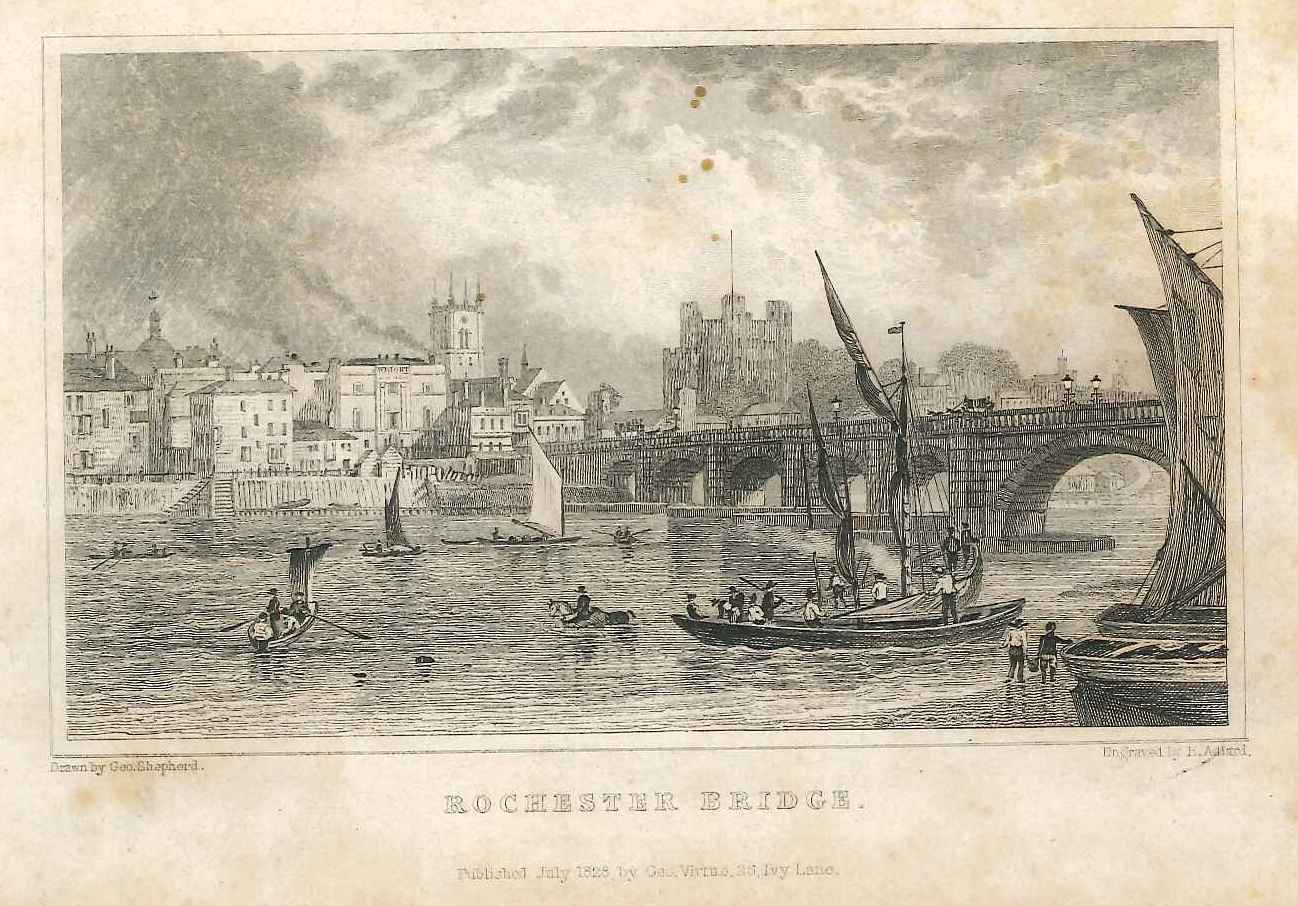 - DescriptionPrint of a view of Rochester bridge with the castle keep & cathedral beyond, from the Strood foreshore; various rowing & sailing vessels, horseman in the shallows; taken from a book. Light staining & foxing. Originally produced for the "England's Topographer" series of Kent views (London 1828-1831).