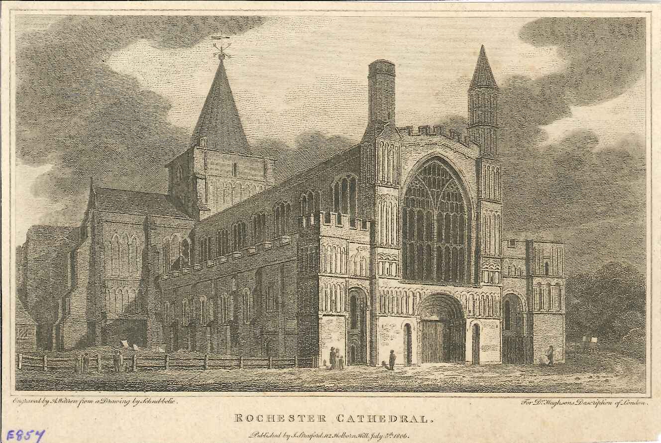 Engraved print of Rochester cathedral; based on a picture by Schnebbelie, engraved by A Warren; shows the western view of the cathedral, pedestrians in the foreground; taken from Dr Hughson's 'Description of London'. From Dr David Hughson's multi-volume illustrated work 'Description of London', published circa 1810; it actually covered an area about 30 miles around London & the home counties.