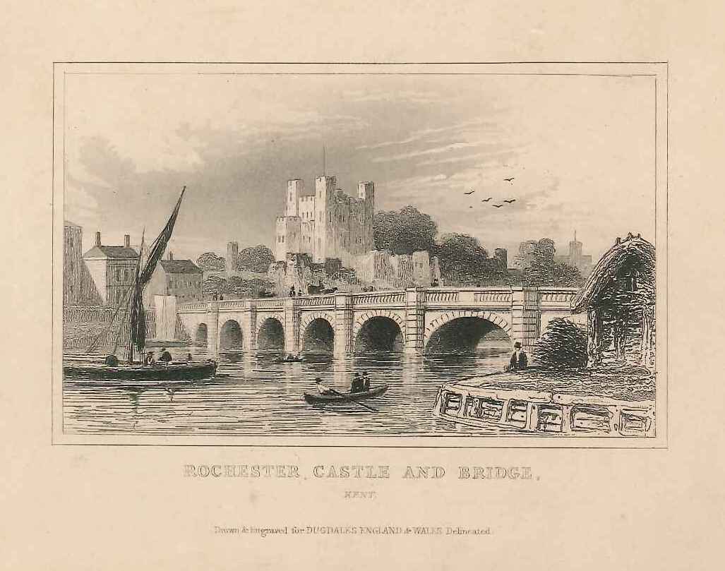 Print of a view of Rochester bridge with the castle keep beyond, from the Strood foreshore (with small ruined timber building); various rowing & sailing vessels; taken from a book. Published in 'Curiosities of Great Britain. England and Wales Delineated. Historical, Entertaining & Commercial. Alphabetically arranged. By Thomas Dugdale, Antiquarian'; a series of volumes published over the period 1835-55.