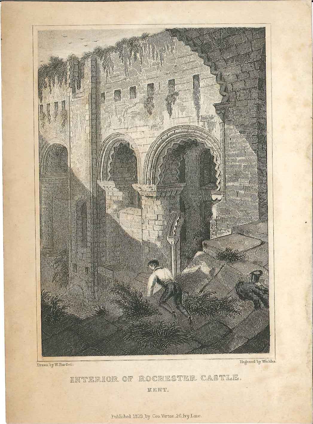 - DescriptionEngraved print of the interior of Rochester castle keep; an observer has removed his hat & coat & peers over a wall edge into the keep; originally produced for the 'England's Topographer' series of Kent views (London 1828-1831). Originally produced for the "England's Topographer" series of Kent views (London 1828-1831).