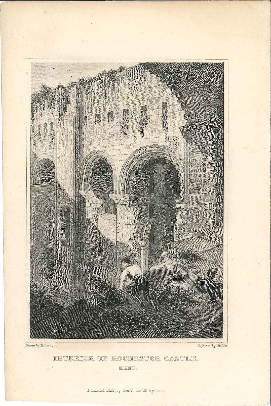 - DescriptionEngraved print of the interior of Rochester castle keep; an observer has removed his hat & coat & peers over a wall edge into the keep; originally produced for the 'England's Topographer' series of Kent views (London 1828-1831). Originally produced for the "England's Topographer" series of Kent views (London 1828-1831).