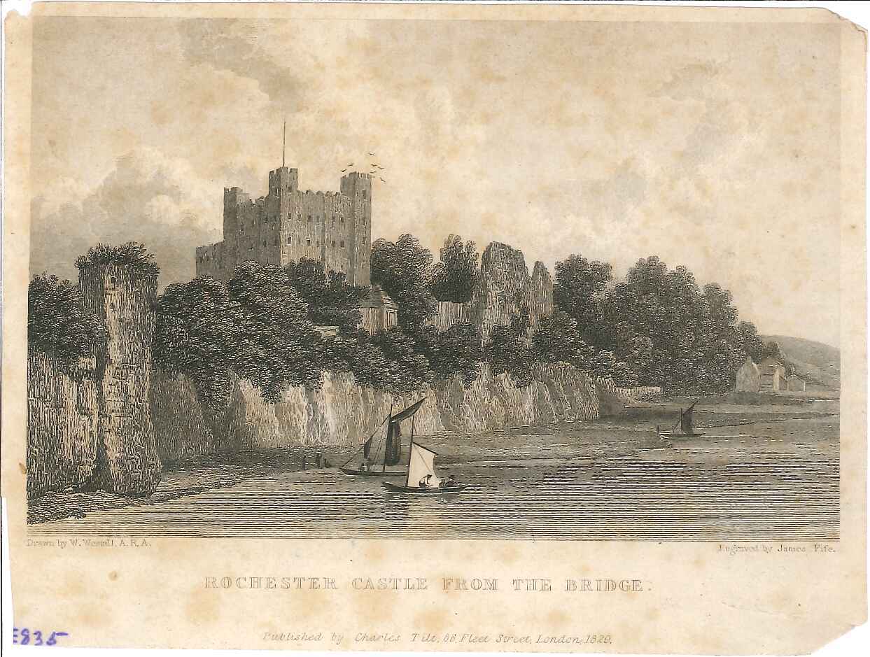 - DescriptionPrint of a view of Rochester castle seen from the bridge; shows chalk cliffs instead of later esplanade; several small fishing boats on the river; some light foxing; produced for a book.