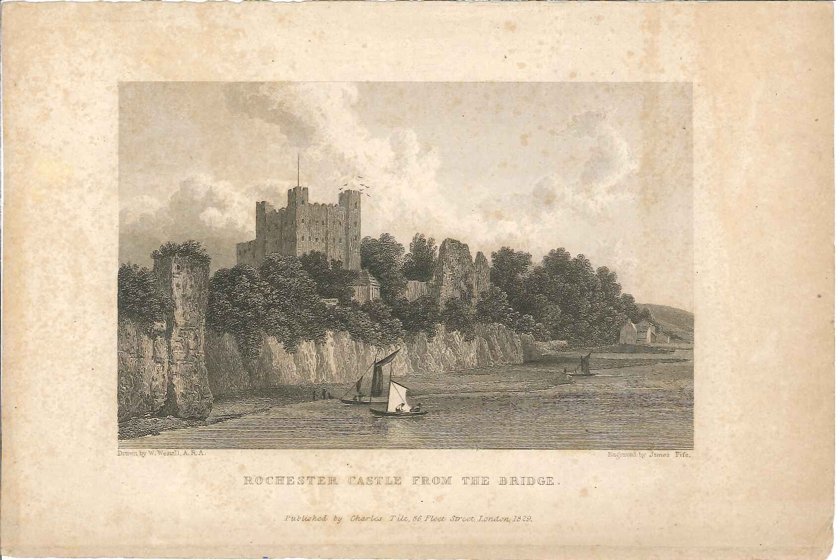 - DescriptionPrint of a view of Rochester castle seen from the bridge; shows chalk cliffs instead of later esplanade; several small fishing boats on the river; some light foxing; produced for a book.