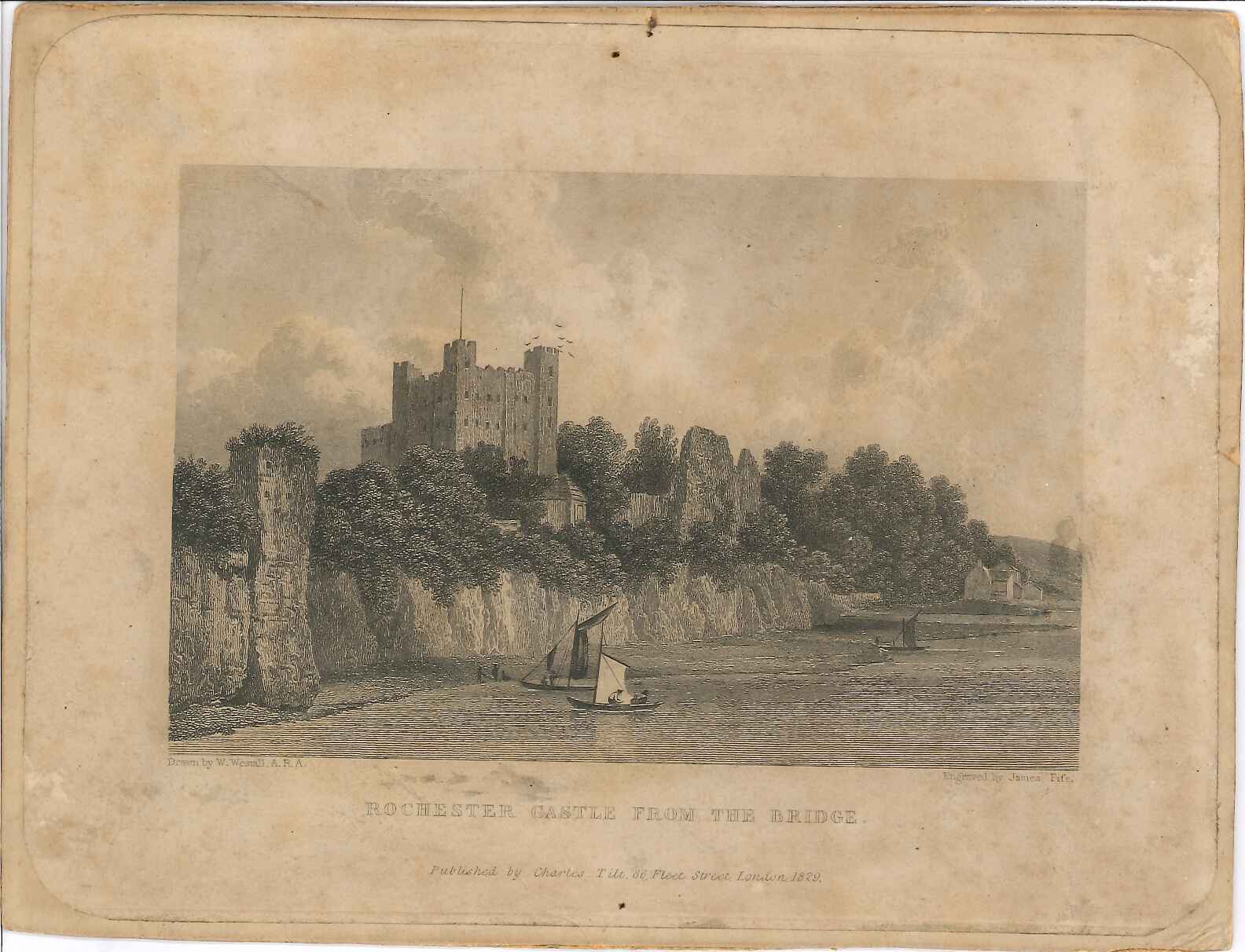 - DescriptionPrint of a view of Rochester castle seen from the bridge; shows chalk cliffs instead of later esplanade; several small fishing boats on the river; some light foxing, overall brown staining; produced for a book. Mounted on card.
