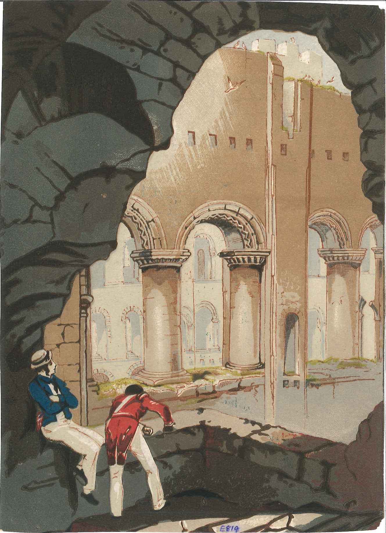 - DescriptionPrint of a view of the interior of Rochester castle keep; shows a soldier & sailor viewing in internal arches & arcading from a raised vantage point; colourised; presumably from a magazine or book.