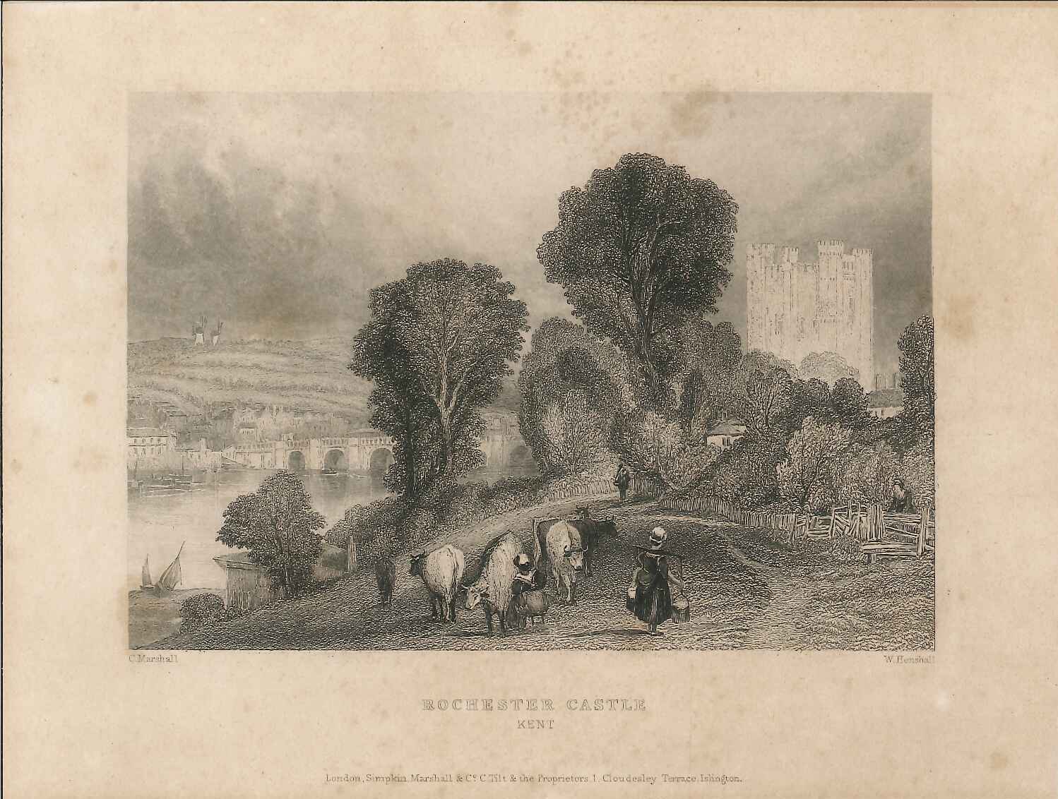- DescriptionEngraved print of Rochester castle; based on a picture by C Marshall, engraved by W Henshall; shows castle from the south, bridge & Strood in the background, 2 windmills on the horizon; foreground has cows & milkmaids.