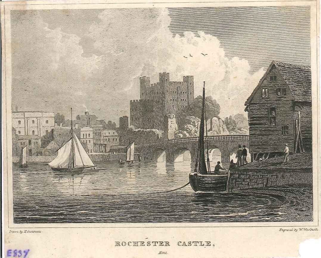 Print of Rochester castle and bridge from the Strood shore near the tide mill (probably built in the 16th century, demolished 1858; in the 18th century it was owned by the Hulkes family, one of whom drowned in the pond; in the early 19th century it was sold to Mr Horsnaill who fitted a steam engine to augment the power); various vessels on the river.