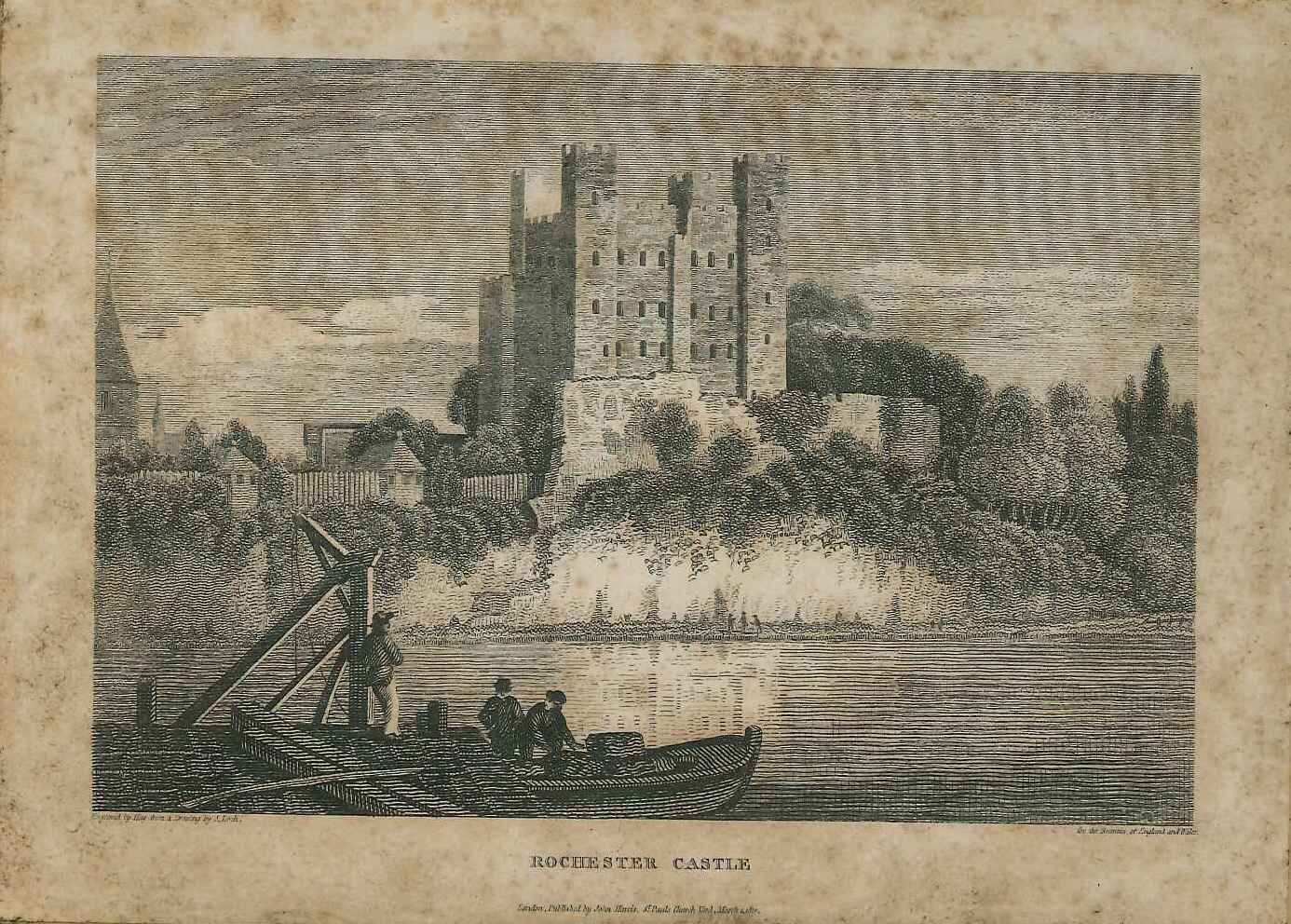 Engraved print of Rochester castle; shows castle from a dock on the Strood shore; cathedral has the pre-1826 configuration tower; from a multi-volume illustrated set by Britton & Brayley; quite badly foxed & stained, in a stained mount. Taken from the multi-volume illustrated set by John Britton & Edward Wedlake Brayley, published over the period circa 1801-1815.