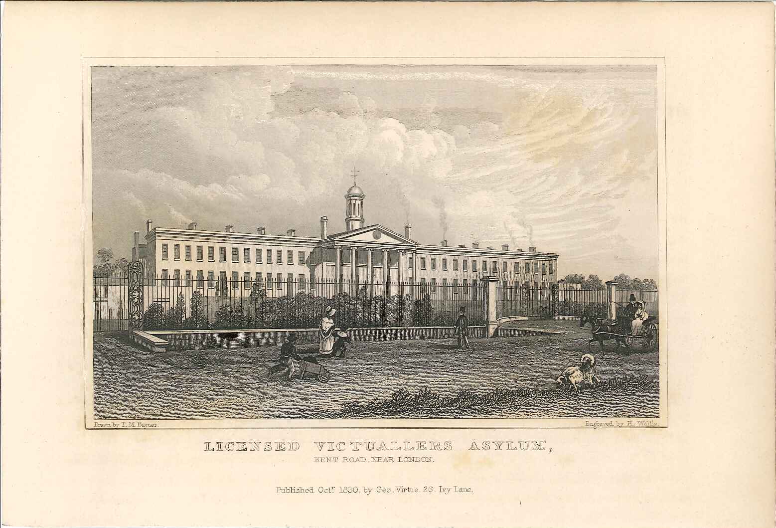 Print of view of the London Victuallers Asylum, Old Kent Road, London; large building seen from the road, pedestrians & traffic in the foreground; originally produced for the "England's Topographer" series of Kent views (London 1828-1831). Founded in 1827 as a home for retired publicans from all over England. It contained several other institutions, including Peckham Lunatic Asylum, Workhouses, St Johns Naval School and the Aged Pilgrims Asylum.