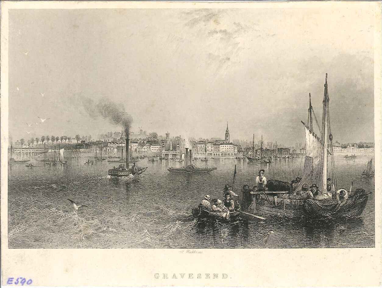 - DescriptionPrint of Gravesend; seen from the river, busy steam & sailing vessels, fishing boat in the foreground.