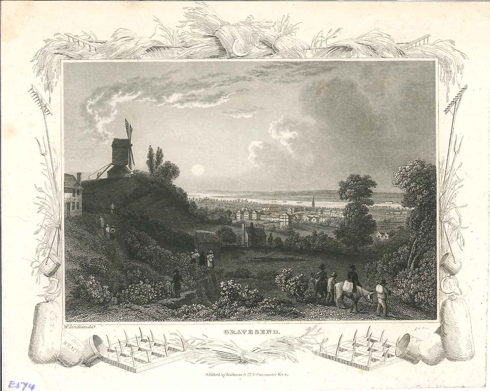 - DescriptionPrint of a view of Gravesend; seen from near Windmill Hill, Gravesend town and the valley of the Thames beyond; from 'Views of the Thames & Medway' (1833-34); decorative printed border. Taken from Tombleson's 'Views of the Thames & Medway', a part-work published 1833-1834.