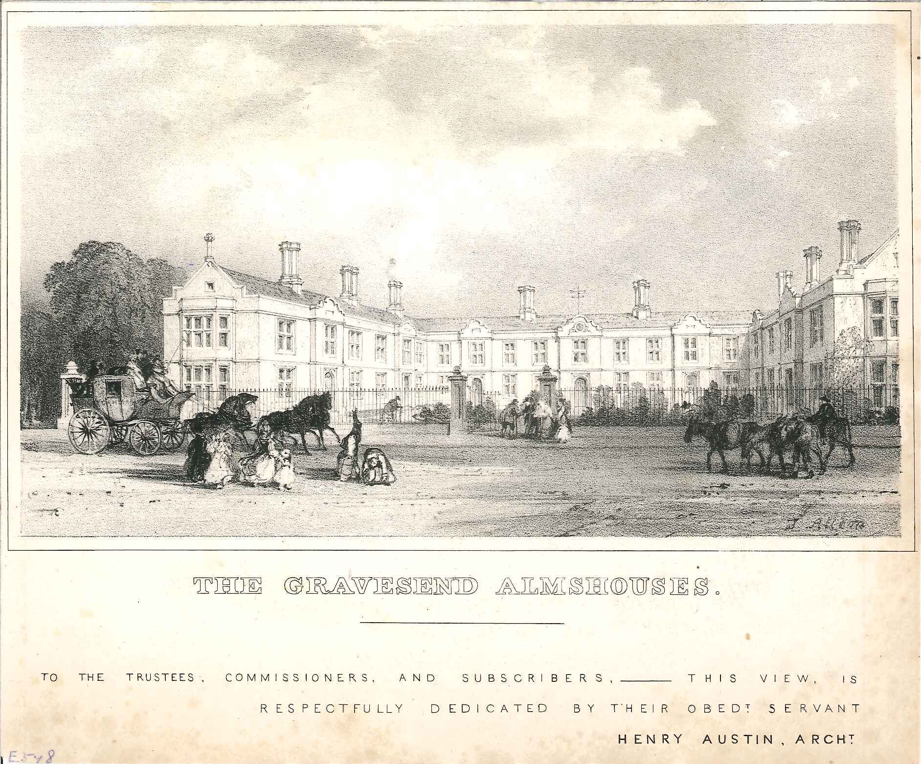 - DescriptionLithographic print of view of the almshouses at Gravesend; shows buildings surrounding a 3-sided square, railings in front; in the foreground are pedestrians, some packhorses & a stagecoach;this view may be a proposed building project by the architect.