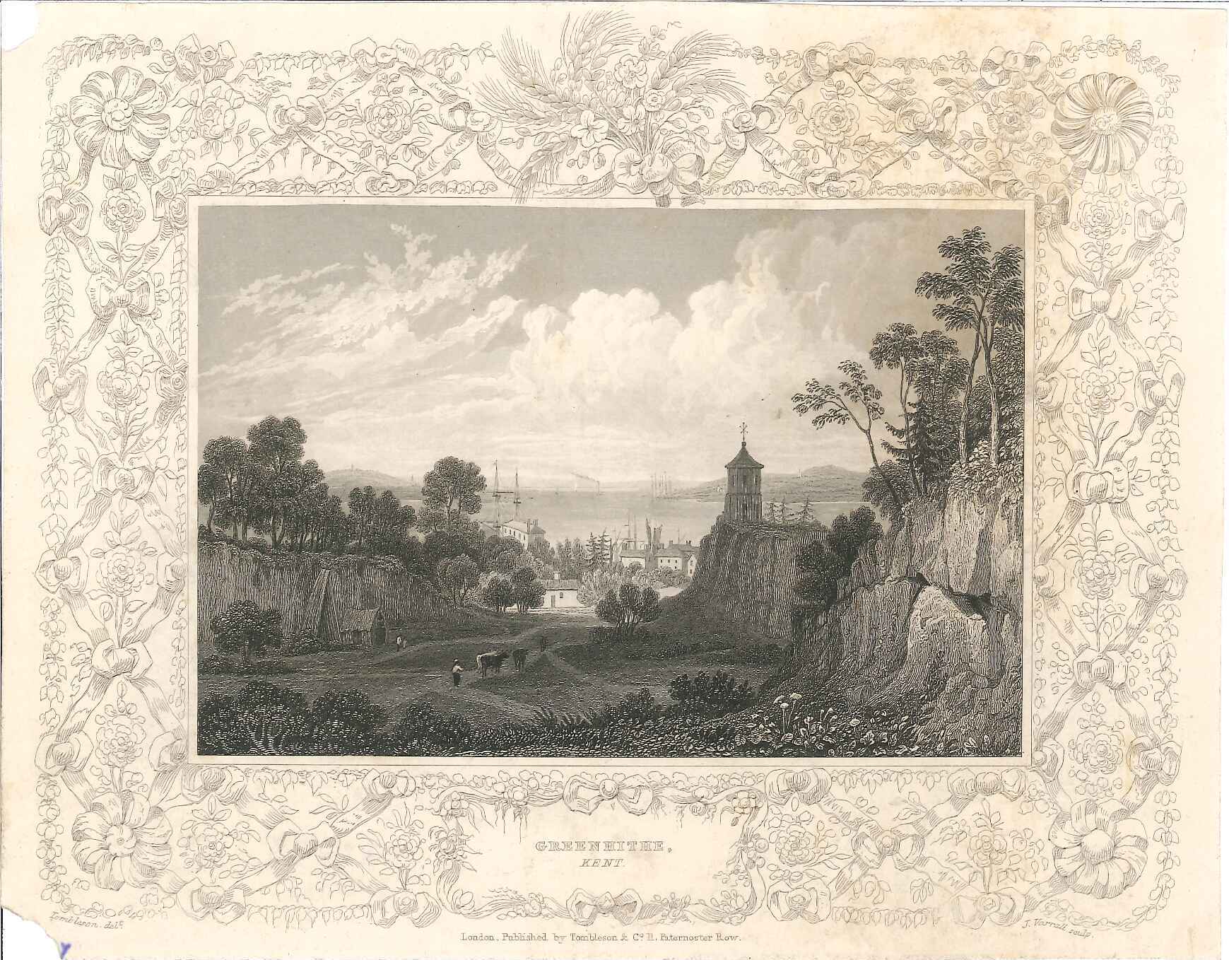 - DescriptionPrint of a view of Greenhithe; seen from a distance from a sloping hill, the Thames beyond; from 'Views of the Thames & Medway' (1833-34); decorative printed border. Taken from Tombleson's 'Views of the Thames & Medway', a part-work published 1833-1834.