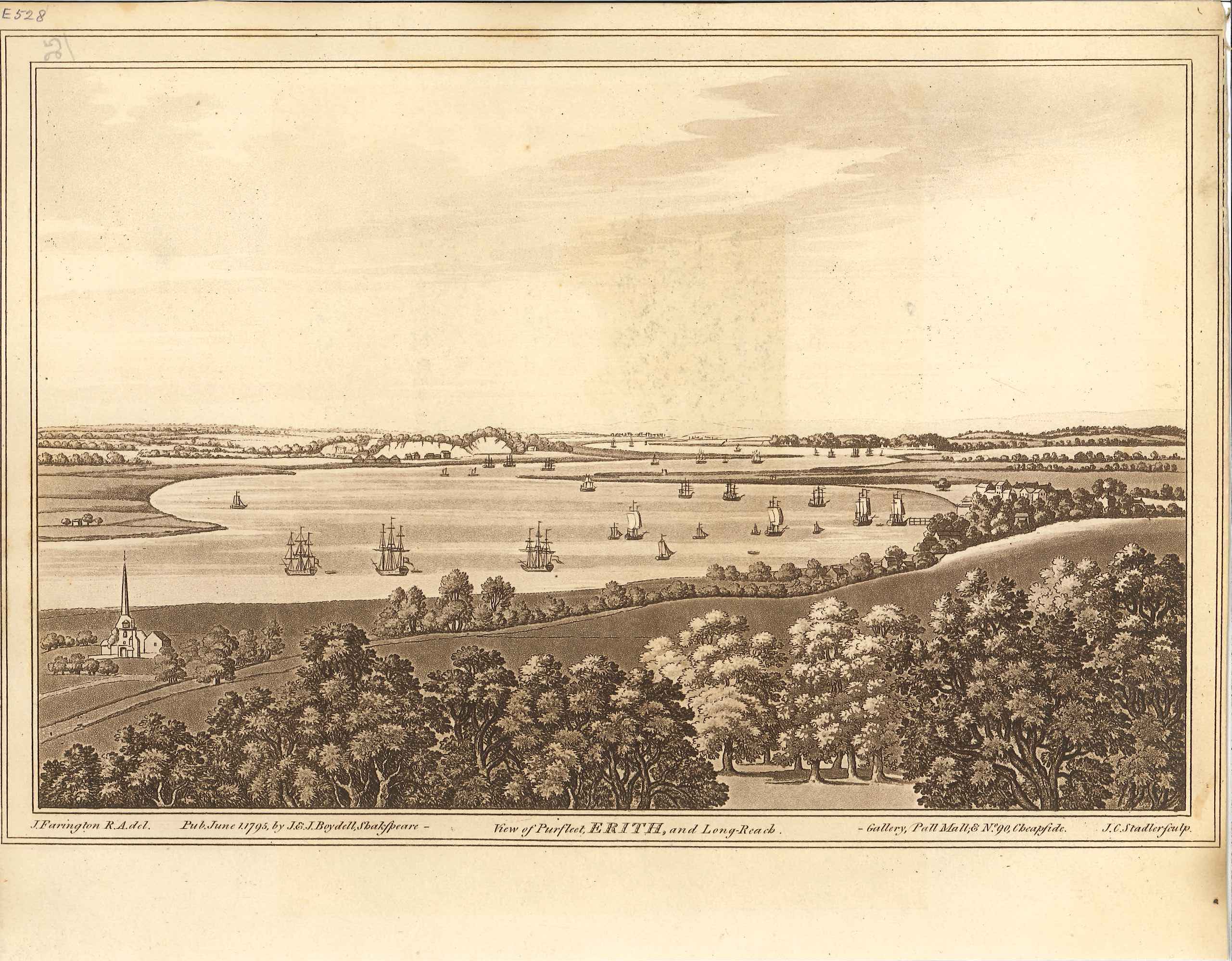 - DescriptionSepia print of a view of the River Thames showing Erith, Purfleet & Long Reach; various sailing vessels & some smaller boats on the river; overall sepia print; possibly a reprint of the original image?