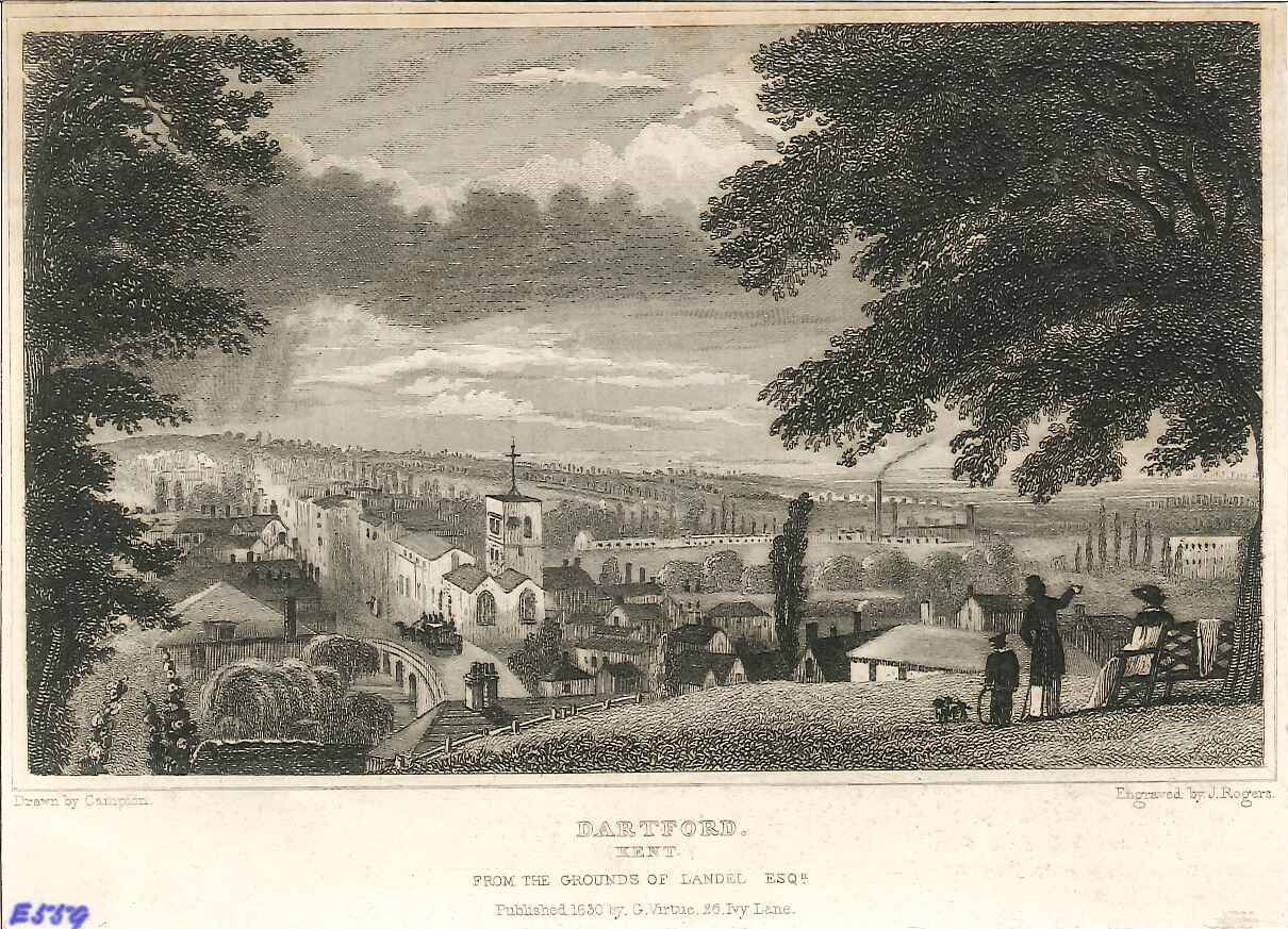- DescriptionPrint of a view of Dartford town, viewed from Easthill; spectators in the foreground. Originally produced for the "England's Topographer" series of Kent views (London 1828-1831).
