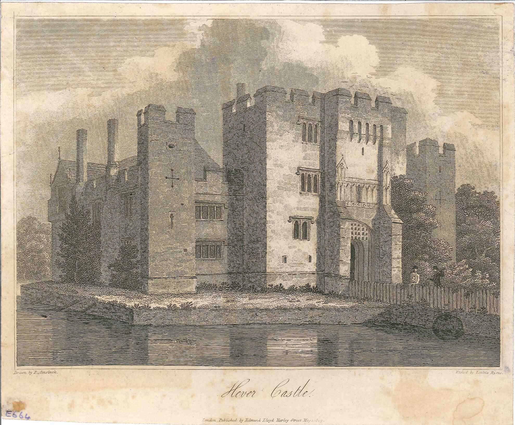 Engraved print of Hever castle; moat in the foreground, 2 figures by the gate.