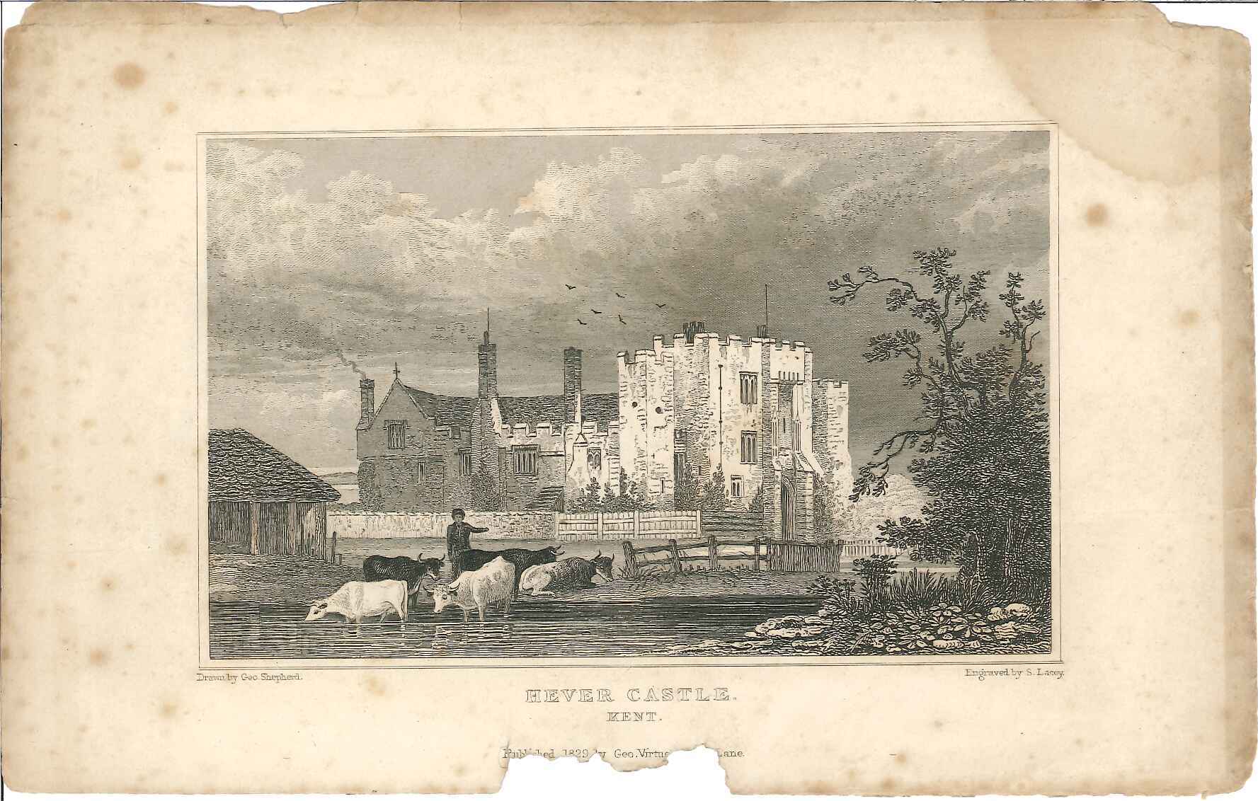 - DescriptionPrint of a view of Hever castle; cattle being watered in the foreground. The edges or torn & stained. Originally produced for the "England's Topographer" series of Kent views (London 1828-1831).