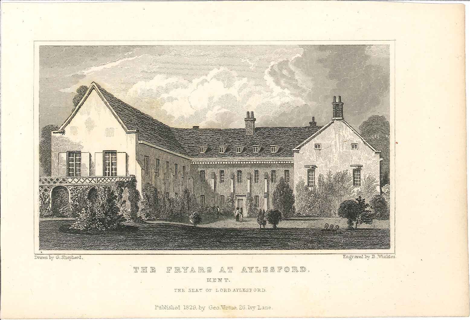 - DescriptionEngraved print of 'The Fryars' at Aylesford (Priory); originally produced for the 'England's Topographer' series of Kent views (London 1828-1831). Originally produced for the "England's Topographer" series of Kent views (London 1828-1831).