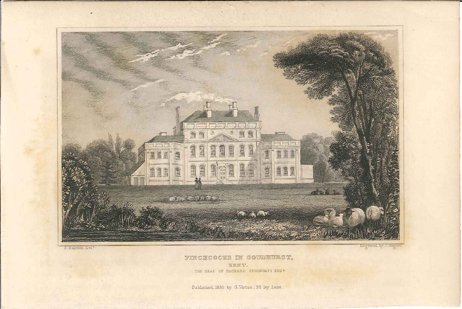 - DescriptionPrint of a view of Finchcocks House, near Goudhurst, Kent. Originally produced for the "England's Topographer" series of Kent views (London 1828-1831).