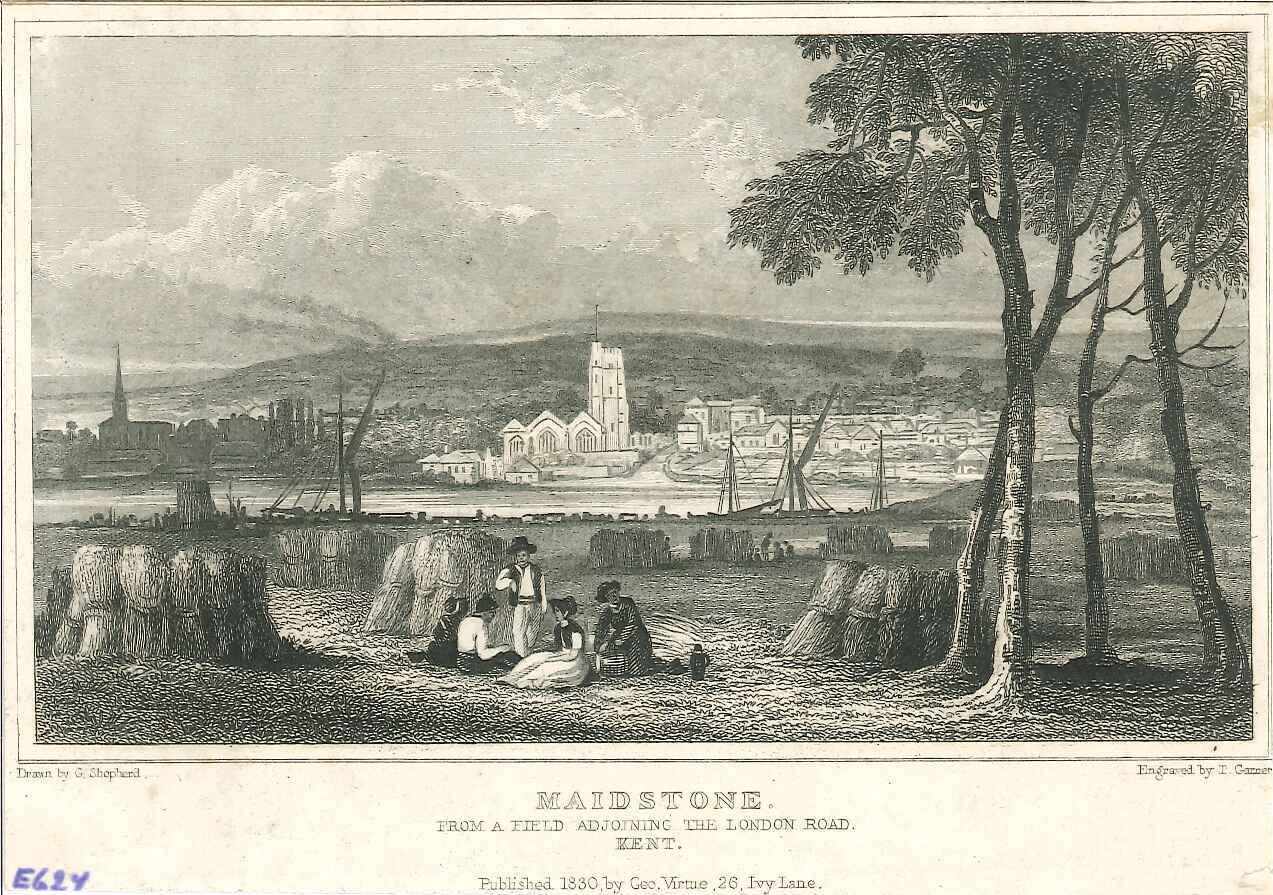 - DescriptionPrint of a view of Maidstone; seen from a distance on the west side of the Medway; barges on the river; group in a wheatfield in the foreground having a picnic. Originally produced for the "England's Topographer" series of Kent views (London 1828-1831).