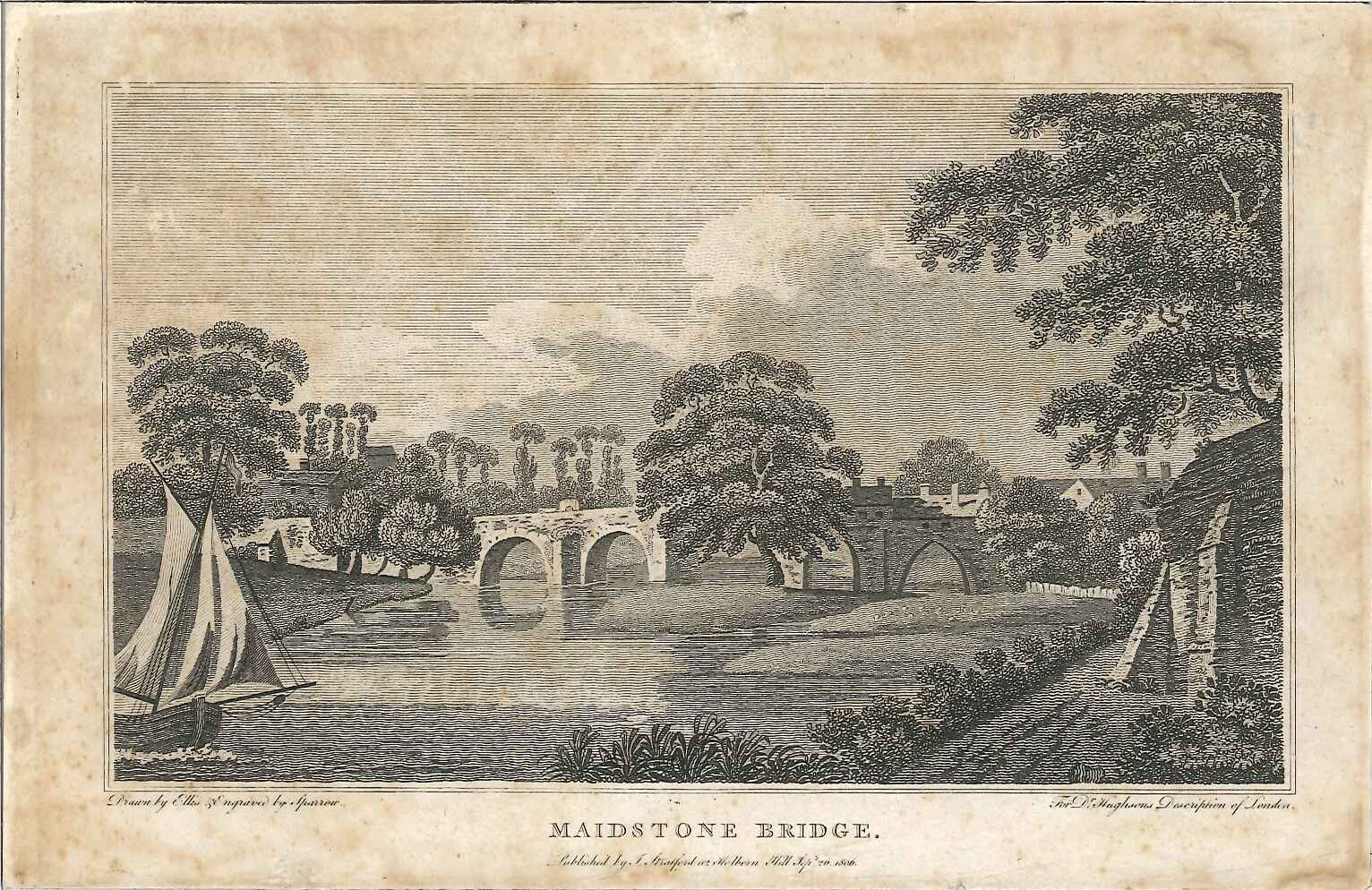 Engraved print of Maidstone bridge; shows the old medieval bridge, wooded river banks, a barge to the left; taken from Dr Hughson's 'Description of London'. From Dr David Hughson's multi-volume illustrated work 'Description of London', published circa 1810; it actually covered an area about 30 miles around London & the home counties. Lightly foxed, mounted on card.