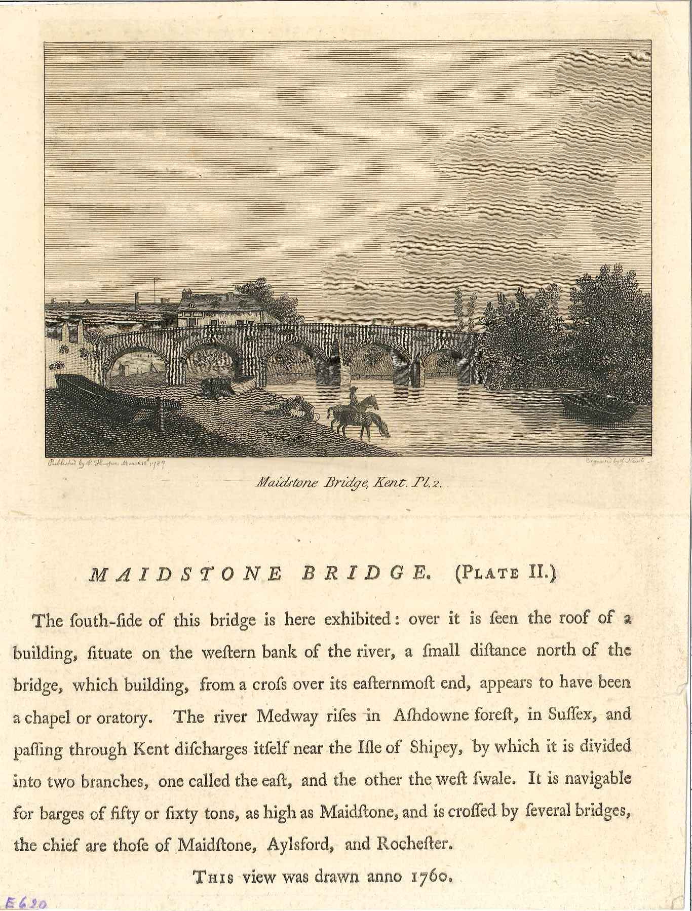 - DescriptionEngraved print of Maidstone bridge with text on one side; shows the old medieval bridge, buildings behind; in the left foreground are beached boats & horses being watered; taken from a book (plate no.).