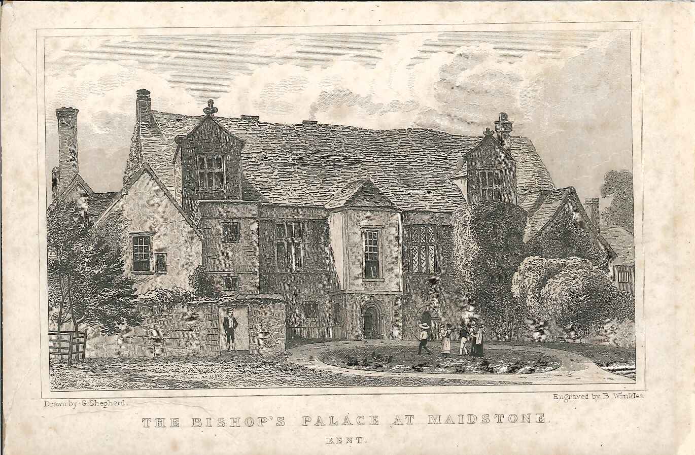 - DescriptionEngraved print of the Bishop's Palace at Maidstone; originally produced for the 'England's Topographer' series of Kent views (London 1828-1831). Mounted on card, lightly foxed. Originally produced for the "England's Topographer" series of Kent views (London 1828-1831).