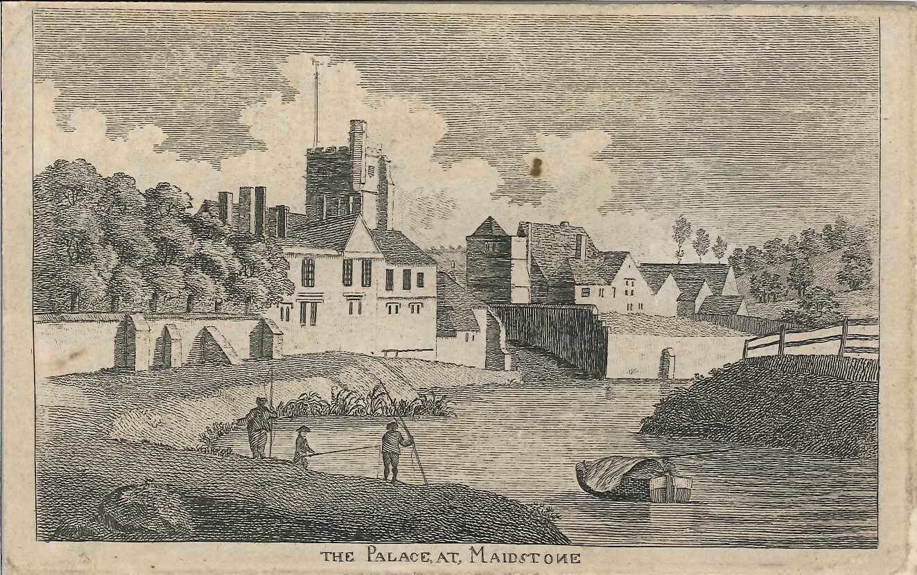 - DescriptionEngraved print of the Bishop's Palace and church at Maidstone; probably viewed from the old bridge; small boat on the river & anglers in the foreground; quite a basic version of this popular view, with crude lettering (including a backwards 'N'). Mounted on card.