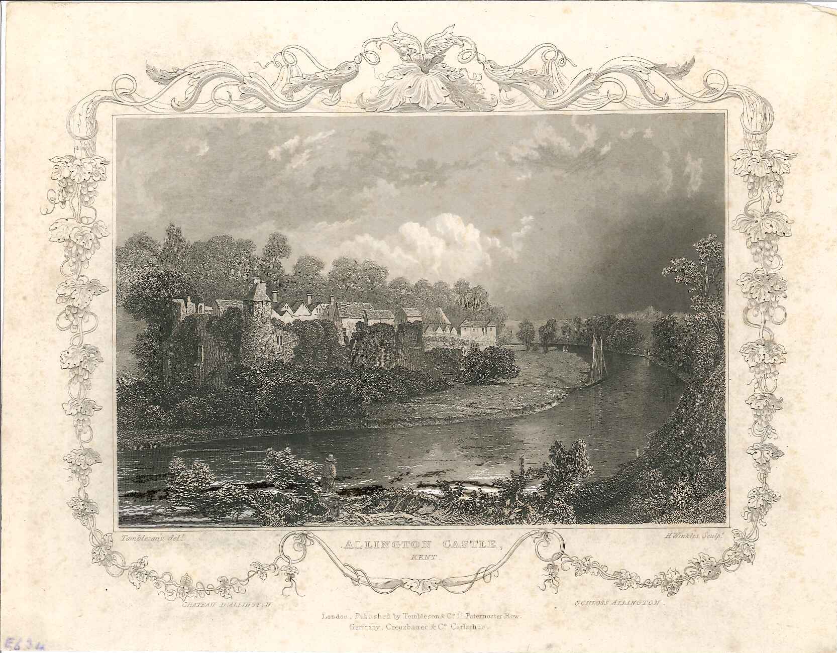 - DescriptionPrint of a view of Allington castle from the opposite bank of the Medway; romantacised view with the valley exaggerated, cloudy sky; from 'Views of the Thames & Medway' (1833-34); decorative printed border. Taken from Tombleson's 'Views of the Thames & Medway', a part-work published 1833-1834. Mounted on card.