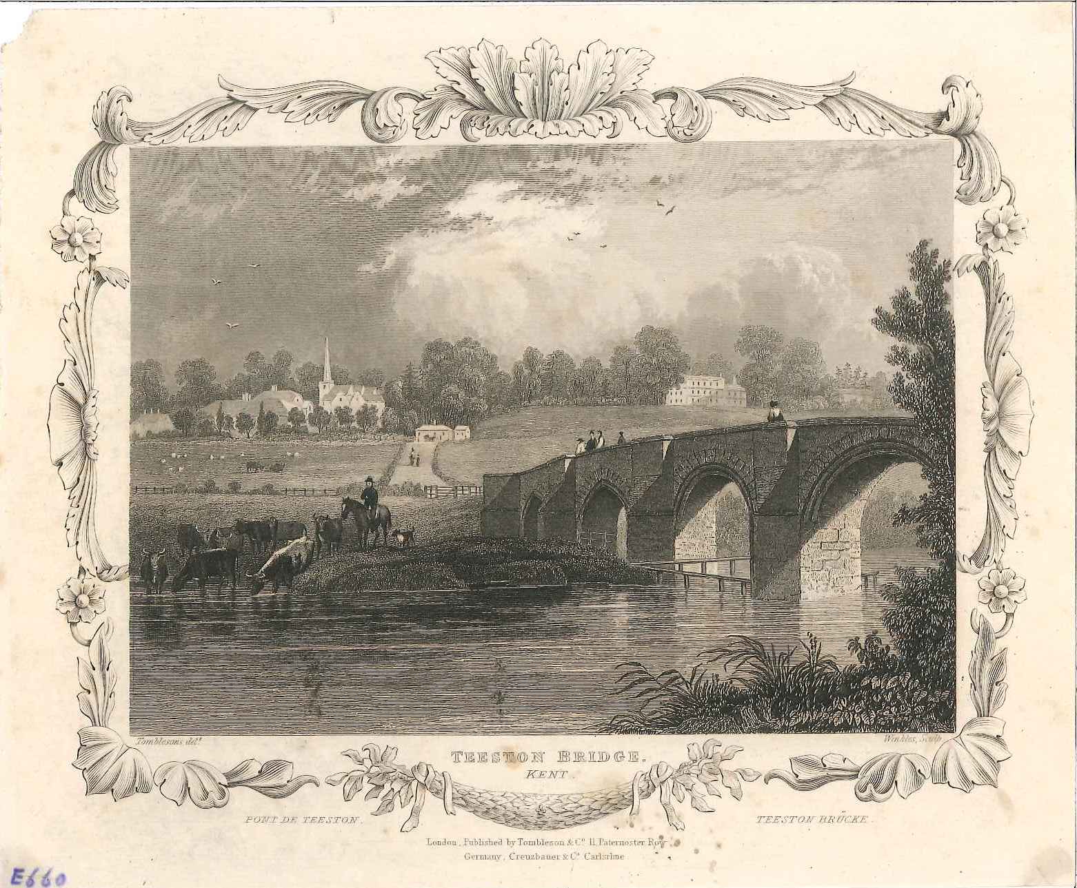 - DescriptionPrint of a view of Teston bridge on the Medway; shows the bridge, some cattle being watered & the church in the distance; from 'Views of the Thames & Medway' (1833-34); decorative printed border. Taken from Tombleson's 'Views of the Thames & Medway', a part-work published 1833-1834.