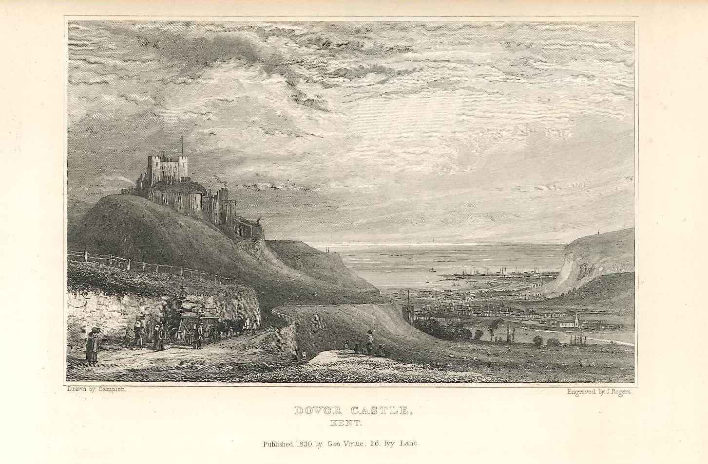 - DescriptionPrint of a view of Dover castle; the town is in the right background; pedestrians & a cart on a road in the foreground. Originally produced for the "England's Topographer" series of Kent views (London 1828-1831).