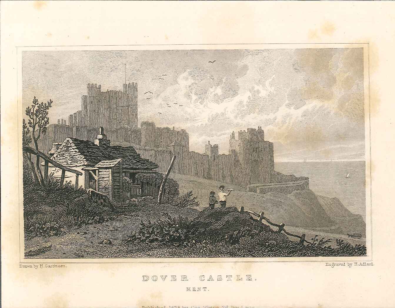 - DescriptionEngraved print of Dover castle in the distance; in the foreground is a derelict timber cottage with a boy & a man with a telescope viewing the sea. Originally produced for the "England's Topographer" series of Kent views (London 1828-1831).