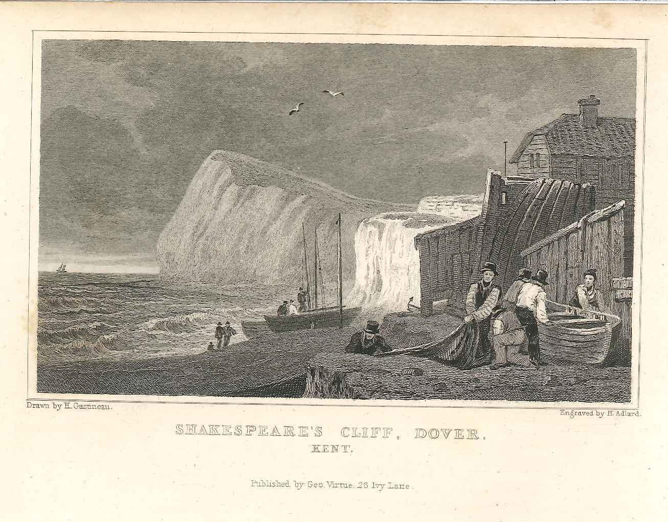 - DescriptionEngraved print of the coast at Dover showing Shakespeare's Cliff; stormy sea, with fisherman working on the beach in the foreground. Originally produced for the "England's Topographer" series of Kent views (London 1828-1831).