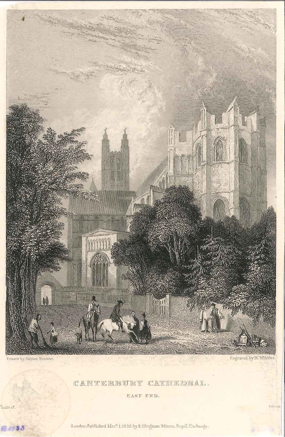 - DescriptionPrint of a detailed view of Canterbury cathedral in 1835, viewed from the East end; pedestrians & riders in the foreground; published for the book 'Winkle's Cathedral Churches of England & Wales' (1836-38).