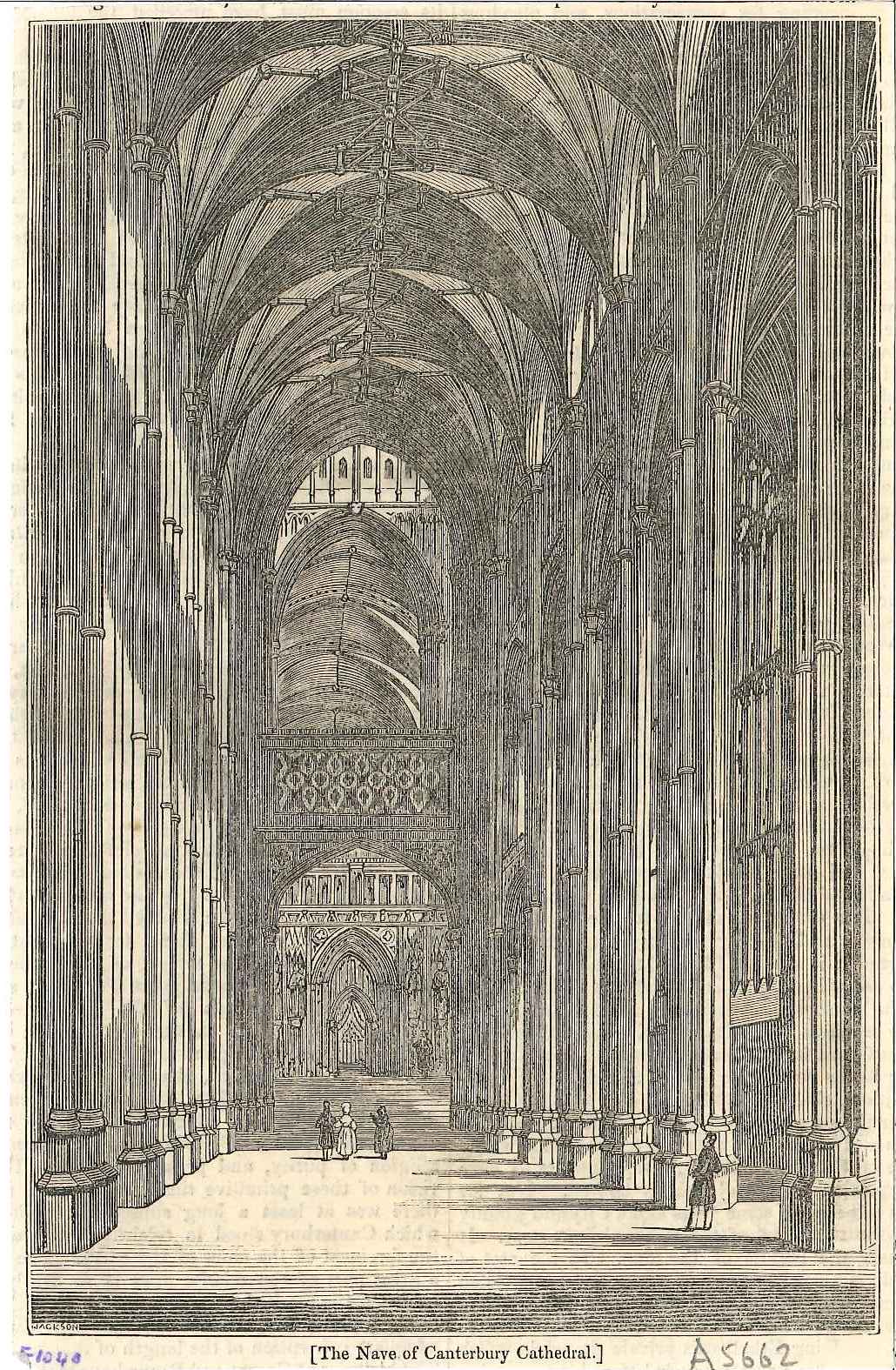 - DescriptionPrint of view of Canterbury cathedral interior, showing the nave; taken from a journal or newspaper, text on the reverse.