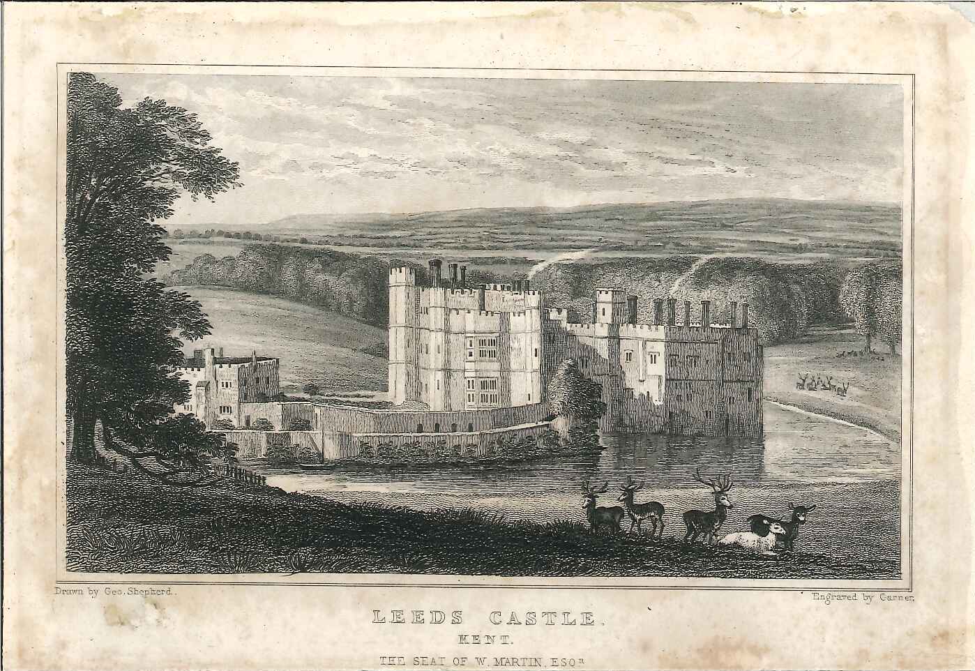 - DescriptionEngraved print of Leeds castle; seen across parkland with deer, mounted on card, light overall foxing. Originally produced for the "England's Topographer" series of Kent views (London 1828-1831).